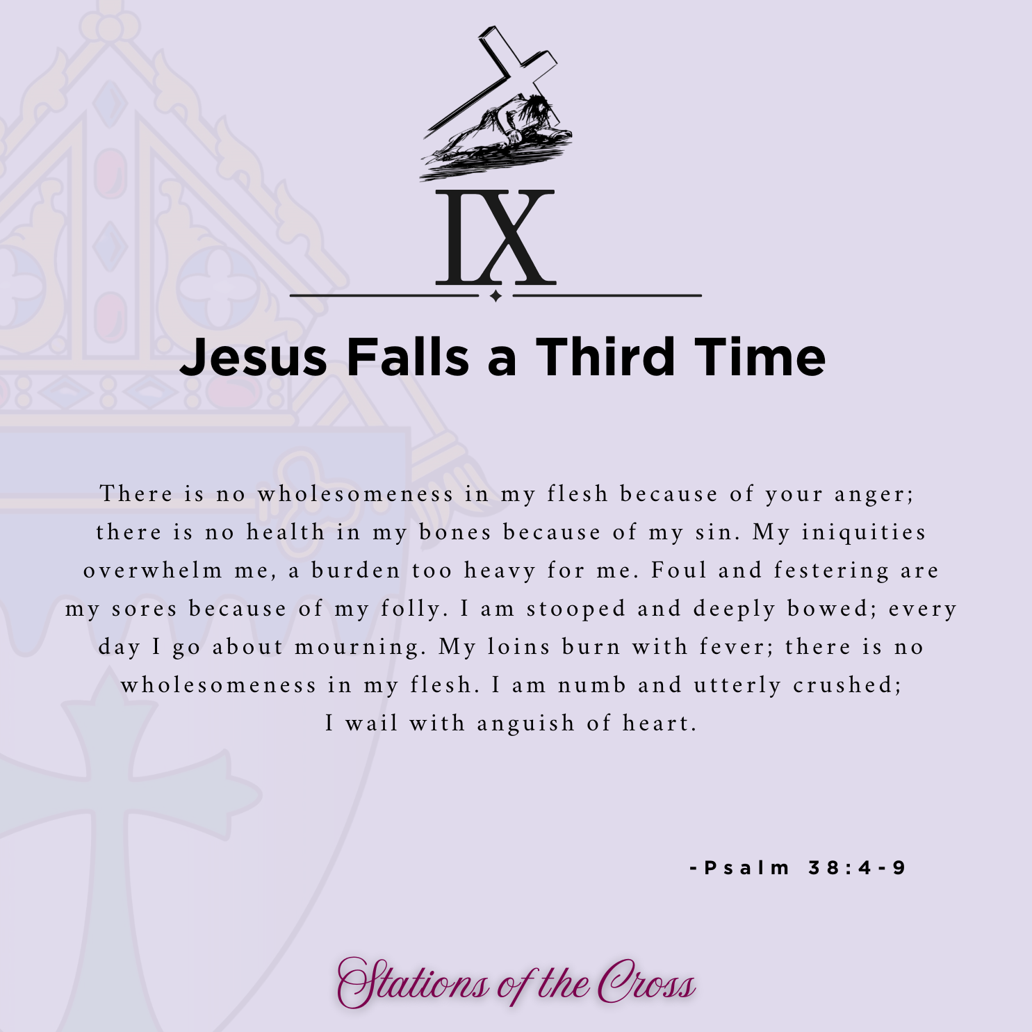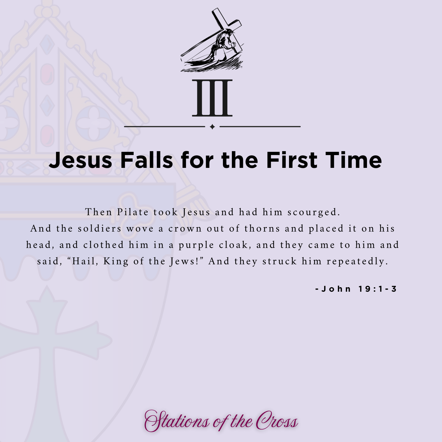 Caption: For the third time, Jesus falls beneath the cross. His strength is nearly gone, yet His love remains.