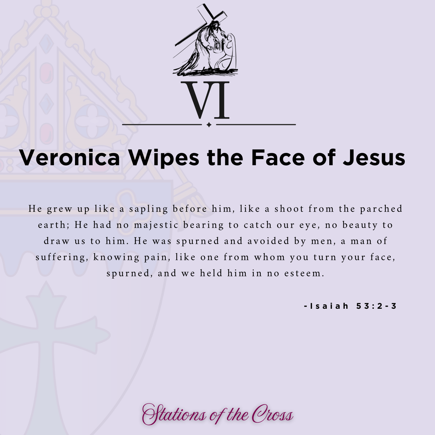 Caption: Veronica steps forward with a simple act of kindness—wiping the face of Jesus. In her courage, compassion leaves its mark.