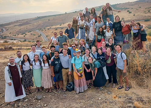 In early October of 2023, 38 students and I from Franciscan University’s Austria campus set off for a nine-day pilgrimage to the Holy Land. I arrived in the Holy Land excited for an amazing week of prayer, walking in Jesus’ footsteps. Led by Father Anthony from Beatitude Missions, we would be roughing it like Jesus — walking throughout Israel and sleeping outdoors, praying and celebrating Mass at the holy sites and serving one another in community. Little did I know that we would be following an itinerary very different from the one we all expected.